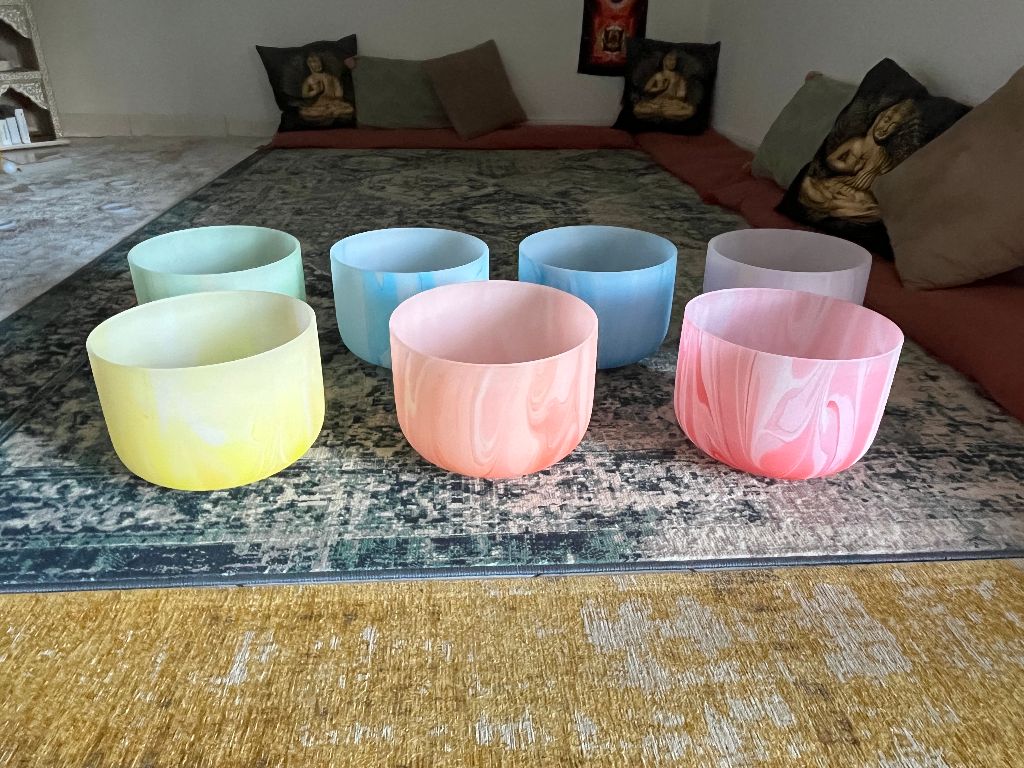 Des bols chantants de cristal liés aux 7 chakras chanteront sur vous et autour de vous pour terminer le soin.