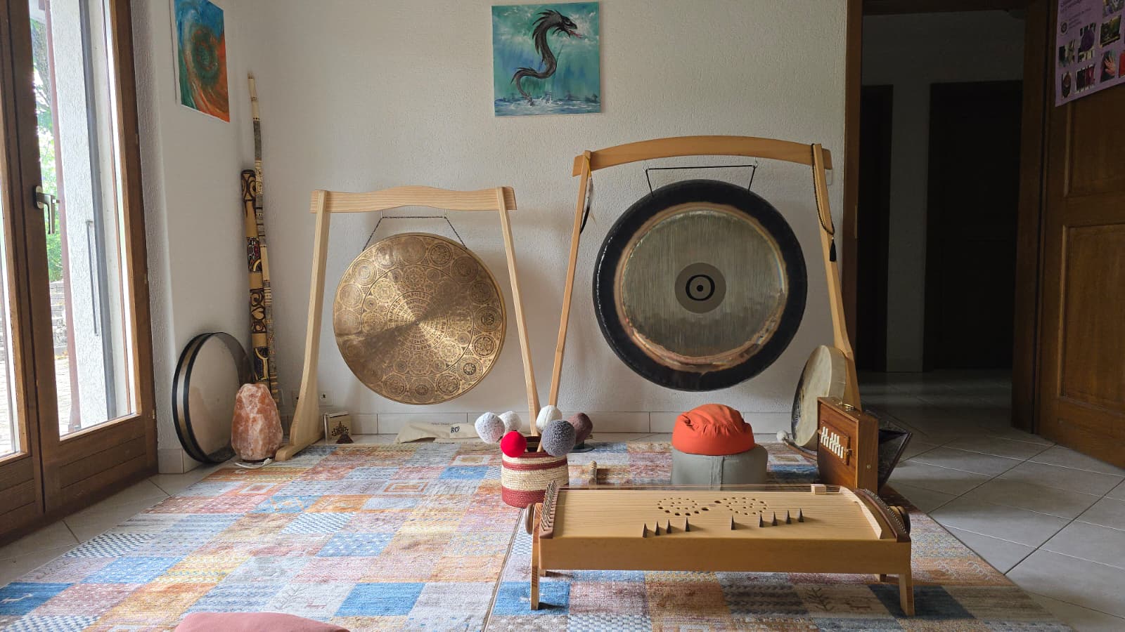 Nous avons créer un espace afin de vous accueillir à Aux Couleurs de l'Âme dans le village de Mettembert pour des immersions sonores avec des gongs, bols chantants Fusion, bols de cristal, tambours chamaniques, shruti box, monocorde et autres instruments.